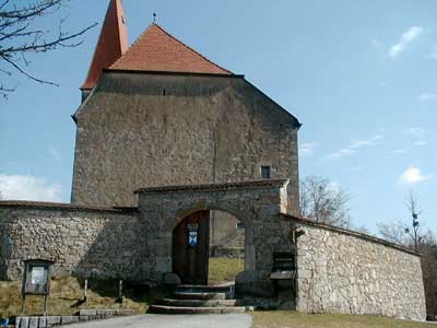 Auf dieser Aufnahme der Westseite sieht man die Mauernaht in der Kirche. Davor der Eingang zum Innenhof, der einst als Friedhof genutzt wurde.