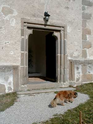 Das gotische Tor mit Schulterbogenschluß führt heute in die Kirche. Rechts davon ist nochmal ein einstiges Mauereck zu sehen, erkennbar an den Eckquadern.