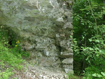 Querschnitt durch die Nordwand. Mitten in der Nordwand ist der Mauerfuß ins tal abgebrochen und einen ausgebrochenen Bogen hinterließ.