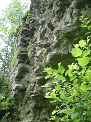Nordwand der letzten Mauerreste. Die äußeren Mauersteine sind mit Teilen des Mauerfußes ins Tal abgebrochen.