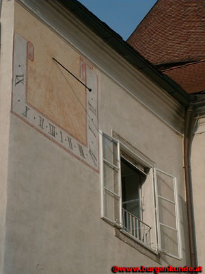 Links vom Eingang ist an einer der äußeren Hausmauern diese Sonnenuhr zu sehen.
