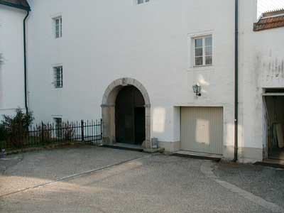 Blick zum Eingangsbereich. Was hier auffällt ist, das es kein Einmannstürl gibt. Über dem Torbogen ist das Wappen der Öder zu sehen.
